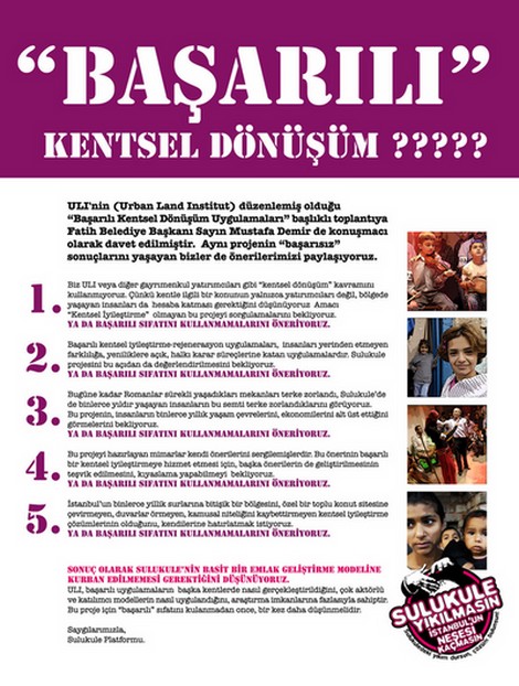 Açıkça söylemek gerekirse, gayrimenkul yatırımcılarını temsil eden bu örgütün bu mizah anlayışı hepimizi etkiledi. Kendilerine, verdikleri destek nedeniyle teşekkür etmek istiyoruz. Kendilerini, İstanbul gibi kentleri birer toplu konut sitesine çevirmeyi amaçlayan, Sulukule, Pendik, Kocaeli projelerini gerçekleştiren bu kuruluşları yukarıdaki başlık altındaki toplantıya davet etmelerinden dolayı, sergiledikleri mizah anlayışı nedeniyle kutluyoruz. Bu nedenle Sulukule Platformu olarak ULI'ye "Başarılı Kentsel Karamizah Uygulamaları" ödülünü vermeyi kararlaştırdık.