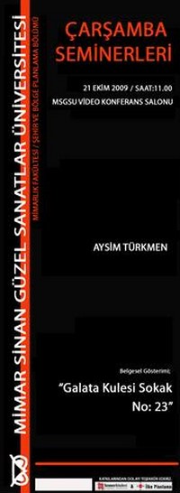 Mimar Sinan Güzel Sanatlar Üniversitesi Mimarlık Fakültesi Şehir ve Bölge Planlama Bölümü tarafından düzenlenen “Çarşamba Seminerleri”ne bu hafta yönetmeni ile birlikte bir belgesel film konuk oluyor. Giderek kaybolmakta olan mahalle içi ilişkilere ve mahalle dükkanlarına dikkat çeken belgeselin adı "Galata Kulesi Sokak No:23" ve yönetmeni Aysim Türkmen... |