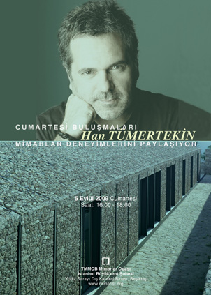 Mimarlar Odası İstanbul Büyükkent Şubesi Cumartesi Buluşmaları kapsamında “Mimarlar Deneyimlerini Paylaşıyor” başlığı altında Han Tümertekin’i konuk ediyor. Çalışmaları üzerinden tasarım felsefesini paylaşacak olan Tümertekin, ayrıca Çin’deki Ordos 100 projesinin öyküsünü anlatacak.