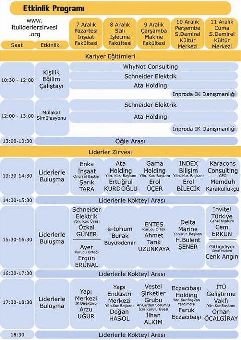 İstanbul Teknik Üniversitesi (İTÜ) Mezunlar Derneği, “ İTÜ Kariyer Eğitimleri ve Liderler Zirvesi” düzenliyor. Etkinlik kapsamından 8 Aralık 2009 Salı günü saat 17.30'da Yapı-Endüstri Merkezi Yönetim Kurulu Başkanı Doğan Hasol da bir konuşma yapacak.