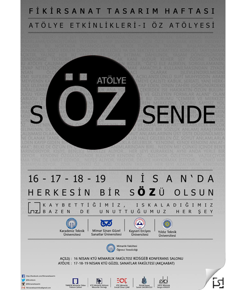 KTÜ Fikir Sanat Tasarım topluluğu tarafından düzenlenen ulusal atölye çalışması, 16-19 Nisan 2015 tarihleri arasında YTÜ, MSGSÜ ve Erciyes Üniversitesi'nden öğrencilerin katılımıyla KTÜ ev sahipliğinde gerçekleşecek