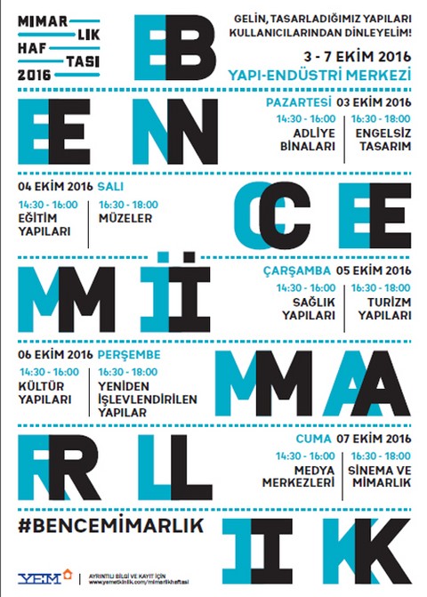 Mimarlığı odağına alan bu özel hafta boyunca, YEM sahnesi farklı meslek alanlarından profesyonelleri ağırlayacak ve bu kez mimarlık, kullanıcıların gözünden mercek altına alınacak. Türkiye'nin önde gelen mimarlarının ve medya dünyasından tanınmış simalarının moderatörlüğünde gerçekleşecek panel dizisinde, konuşmacılar mesleklerini icra ettikleri yapı tipolojilerine ilişkin deneyimlerini, ihtiyaçlarını, gözlemlerini #bencemimarlik teması çerçevesinde anlatacaklar. Mimarlık Haftası'na Özel 10 Oturum Yapı-Endüstri Merkezi (YEM)'in Fulya'daki ana salonunda, 3-7 Ekim 2016 tarihleri arasında gerçekleşecek olan Mimarlık Haftası etkinlikleri; 'Adliye Binaları', 'Engelsiz Tasarım', 'Eğitim Yapıları, ‘Müzeler', 'Sağlık Yapıları', 'Turizm Yapıları', 'Kültür Yapıları', 'Yeniden İşlevlendirilen Yapılar', 'Medya Merkezleri', 'Sinema ve Mimarlık' başlıklı on ana oturumu kapsıyor. Farklı meslek disiplinlerinin mimarlıkla ilişkisi üzerinden kurgulanan panel dizisinde, bu alanlardan meslek profesyonellerinin mimarlığa ilişkin yorumlarını, kullanıcısı oldukları mimari mekânlara ilişkin deneyimlerini ve beklentilerini mimarlarla paylaşması amaçlanıyor. Farklı meslek profesyonelleri mimarlığı anlatacak Edebiyat, hukuk, eğitim, tıp, sanat, turizm, sinema ve medya dünyasından önde gelen isimlerin yer alacağı oturumlarda her konuşmacı yaşadığı, çalıştığı çevreye ilişkin deneyimlerini #bencemimarlik temasıyla anlatacak.Hafta boyunca YEM'de sahne alacak isimler arasında, Sinema Eleştirmeni/Mimar Atilla Dorsay, Garajistanbul Kurucusu/Oyuncu Mustafa Avkıran, Doğan Kitap Yayın Direktörü Cem Erciyes, Yönetmen Feride Çiçekoğlu, Yönetmen Derviş Zaim, Pozitif Kurucu Ortağı Cem Yegül, Lütfi Kırdar Uluslararası Kongre&Sergi Sarayı Genel Müdürü Güniz Atış Azrak gibi isimler bulunuyor. Tüm YEM etkinliklerinde olduğu gibi, bu etkinliğin de mimarların mesleki gelişimine katkı sunması hedefleniyor.