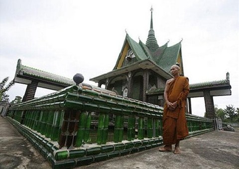 Tayland’ın Sisaket bölgesinin keşişleri, topladıkları bir buçuk milyon bira şişesinden tapınak inşaat ettiler. Wat Pa Maha Chedi Kaew tapınağı yeşil ve kahverengi bira şişelerinden yapıldı. Geri dönüşümlü şişelerin tercih edildiği yapı için şişe toplama işine 1984 yılında başlandı. Başlarda az olan şişe sayısı amacın öğrenilmesinin ardından son zamanlarda artmaya başladı. Tapınağın içinde krematoryum bölgesi, dua odası, salon, banyo bulunuyor. Ayrıca etrafında da şişelerle bir su kulesi ve birkaç tane bungalov inşa edildi. Rahipler, şişelerin temizlenmesinin kolay olduğunu ve iyi aydınlatma sağladıklarını söylüyor. Bir Alman bira firmasının yeşil şişeleriyle, yerel bir biranın kahverengi şişeleri kullanılarak yapılan bina için bir de bira şişelerinin kapaklarından Buda mozaiği yapıldı. Yapım için yaklaşık 1,5 milyon geri dönüşümlü şişe kullanıldı, daha fazla yapı için şişe toplama işlemi de sürdürülüyor. |