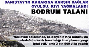 b>Bodrum'un Yalıkavak beldesinde, belediyenin, Kıyı Kanunu'na muhalefet ederek 2004 yılında yaptığı plan değişikliğiyle 27 kilometrelik sahil alanını imara açmasıyla inşa edilen 3 bin 500 villa, Danıştay'ın verdiği kararla kaçak duruma düştü. Danıştay'ın 24 Ekim 2007 tarihinde verdiği karara rağmen bölgede inşaatlar tüm hızıyla sürüyor. Bölgede kıyı talanı yapılırken, Yalıkavak'ın CHP'li Belediye Başkanı Mustafa Saruhan, sorunu çözmek için Ankara'yı yol yaptı.