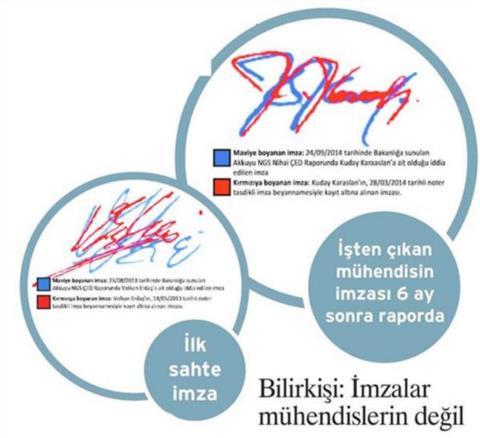 BirGün gazetesinde Doğu Eroğlu'nun imzasıyla yayımlanan haber şöyle: Mersin'in Büyükeceli beldesi yakınlarına kurulmak istenen Akkuyu Nükleer Güç Santralı'na (NGS) ait Çevresel Etki Değerlendirmesi (ÇED) Raporlarında, sorumlu nükleer enerji mühendislerinin imzalarının taklit edildiği, raporların yatırımcı firma ve ÇED firması tarafından revize edildiği sırada hiçbir nükleer enerji mühendisi tarafından görülmediği anlaşıldı. İmzaların gerçekliğini kontrol etmeyen Çevre ve Şehircilik Bakanlığı, raporun sunulduğu tarihte işten çıkmış olan nükleer enerji mühendislerinin imzalarının taklit edildiği ÇED raporunu kabul etti, sonra da rapor hakkında ÇED Olumlu Kararı vererek nükleer enerji santralı yatırımını onayladı. Hakkında ÇED Olumlu Kararı verilen Nihai ÇED Raporunda imzası bulunan nükleer enerji mühendisinin, raporun tesliminden 6 ay önce işten ayrıldığı, ayrılan mühendisin imzasının raporda taklit edildiği, TMMOB'ııin talebi üzerine imzalar üzerinde yapılan kriminal incelemede anlaşıldı. 3 ayrı bilirkişi yaptıkları bağımsız incelemelerde. Bakanlık tarafından onaylanan raporda yer alan sorumlu nükleer enerji mühendisi imzalarının, mühendisler tarafından atılmadığı kanaatine vardı, ilerleyen günlerde hem sahte imzalı rapora verilen ÇED Olumlu kararının hem de raporu hazırlayan ÇED Mühendislik firmasının lisansının iptali bekleniyor. İlk skandal 2013'te Pek çok kent, çevre ve enerji yatırımı ile projeleri için zorunlu tutulan. Çevre ve Şehircilik Bakaıılığı'nca yürütülen ÇED süreci, Mersin'e kurulması planlanan Akkuyu NGS projesi için 2 Aralık 201 l'de başladı. Rusya devlet şirketi Rosatom Overseas'in kurduğu Akkuyu NGS A.Ş., 2 Aralık'ta Çevre ve Şehircilik Bakanlığına ÇED Başvuru Dosyası'nı sundu. 21 Mayıs'ta yatırımcı şirkete iletilen özel format uyarınca, düzenlenecek ÇED Raporunun esasları belirlendi. Bakanlık, ÇED Raporunun hazırlayacak ÇED mühendislik firmasında nükleer enerji mühendisi çalıştırılmasını şart koştu. Fakat nükleer enerji mühendisleri sorumluluğunda hazırlandığı iddia edilen ve ÇED süreci boyunca Bakanlığa teslim edilen çeşitli ÇED Raporlarında, sorumlu mühendislerin imzalarının taklit edildiği görüldü. Taklit edildi Akkuyu NGS ÇED Raporlarındaki imza skandallaı ı en az iki defa yaşandı. ÇED Raporlarının Bakanlığa sunulduğu tarihlerde, ÇED Raporunu hazırlayan ÇED Mühendislik firmasında çalışmayan mühendisler adına atılan imzaların sahte olduğu bilirkişi öninceleme raporuyla anlaşıldı. Dokay ÇED Mühendislik tarafından hazırlanan ilk ÇED Raporu 4 Temmuz 2013'te Bakanlığa teslim edildi ancak rapor eksiklerden ötürü 15 Temmuz'da iade edildi. Raporda imzası bulunan nükleer enerji mühendisi Volkan Erdaş, raporun tesliminin ardından 31 Temmuz'da işten ayrıldı. Ancak görevi bırakan Erdaş'ın, 23 Ağustos 2013 tarihinde eksiklikler giderilerek Bakanlığa yeniden sunulan raporda da imzasının bulunduğu görüldü. Mühendis görmedi İkinci sahte imza skandalıysa 2014'te gerçekleşti. ÇED Raporunun iade edilmesinin ardından, Dokay ÇED Mühendislik firması yeni bir ÇED Raporu hazırlamaya başladı. Göreve gelen yeni nükleer enerji mühendisi Kuday Karaaslan'ın imzasının bulunduğu ÇED Raporu 31 Mart 2014'te Bakanlığa sunuldu. Raporun sunulmasına günler kala, 19 Mart 2014'te Karaaslan Dokay ÇED Mühendislik firmasıııdaki görevinden ayrıldı. Raporun Bakanlık tarafından kabul edilmesiyle 24 Temmuz 2014'te, resmi kurumların projeyi değerlendireceği İnceleme Değerlendirme Komisyonu Toplantısı gerçekleştirildi. ÇED Raporunda, İDK toplantısına katılan kurumların görüş ve önerileri doğrultusunda yeniden değişiklikler yapıldı ve 24 Eylül 2014 tarihli Nihai ÇED Raporu yeniden Bakanlığa sunuldu. Ancak 24 Eylül tarihli Nihai ÇED Raporunda, 6 ay önce işten ayrılan nükleer enerji mühendisi Karaaslan'ın imzası vardı. Akkuyu NGS ÇED Raporunu hazırlayan nükleer enerji mühendislerinin, raporların Bakanlığa sunulduğu tarihlerde ÇED Mühendislik firmasında çalışmadığının anlaşılması üzerine, imzaların gerçekten mühendislere ait olup olmadığı tartışma konusu oldu. TMMOB, mühendislerin noter tasdikli imza beyannameleri ile ÇED Raporlarına atılan imzaları, karşılaştırılmak üzere bilirkişi önincelemesine gönderdi. Belgeler üzerinde Makroskop Asimeto SZM4, Regula VideoScope 4177 ve 4027, Regula 1010 Proffessional Compact Device ve Video Spectral Comparator 4305 MH cihazlarıyla grafolojik, fiziki ve optik incelemeler yapan üç kişilik bilirkişi heyeti, önincelemede imzaların sahte olduğu kanaatine vardı. Bilirkişiler, yaptıkları bağımsız incelemelerde, hakkında ÇED Olumlu Kararı verilerek nükleer santrala onay verilen Nihai ÇED Raporunda, tüm rapordan sorumlu nükleer enerji mühendisi Ahmet Kuday Karaaslan'ın imzasının kendi imza beyannamesindeki imza örneğiyle karşılaştırdı. Bilirkişiler, ÇED Raporundaki imzanın "İmza beyannamesine kıyasen Kuday Karaaslan'ın eli ürünü olmadığı" kanaatine vardı. Bilirkişiler, nükleer enerji mühendisi Volkan Erdaş'a ait olduğu ileri sürülen imzanın da, kendisi tarafından atılmadığına ilişkin görüş bildirdi. Mühendis imzayı biliyor Akkuyu Nükleer NGS ÇED Raporlarını hazırlayan Dokay ÇED Mühendislik firmasında çalışmadığı tarihte hazırlanan raporda imzası bulunan nükleer enerji mühendisi Kuday Karaaslan'a BirGün ulaştı. Raporda imzası bulunduğunu kabul eden Karaaslan, imzayı bizzat atıp atmadığı konusunda kesin açıklamalar yapmaktan kaçındı. Kurum görüşleri gizlenmişti Yurttaşların ve hukukçuların tüm başvurularına karşın bilgi edinme hakkı ihlalleri Akkuyu NGS ÇED sürecinin tamamına damga vu