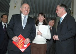 b>Almanya’nın Ankara Büyükelçisi Eckart Cuntz, İstanbul Büyükşehir Belediye Başkanı Kadir Topbaş’ı Saraçhane Belediye Sarayı’ndaki makamında ziyaret ederek bir saat kadar görüştü. Ziyaretin ardından gazetecilere açıklamalarda bulunan Başkan Kadir Topbaş, Büyükelçi Eckart Cuntz’un Almanya’nın İstanbul’da bir Alman Devlet Üniversitesi kurmak istediğini kendisine ilettiğini söyledi. |