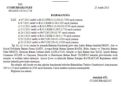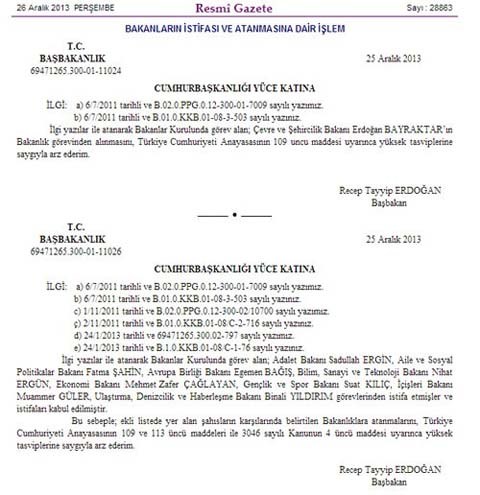 Başbakan Tayyip Erdoğan, büyük rüşvet operasyonu sonucu beklenen kabine değişikliğini dün gece yaptı. 10 bakan değişikliği yapılırken kabinede 9 yeni isim yer aldı. Yeni isimler bugün Resmi Gazete'de de yer aldı. Ancak Resmi Gazete'deki açıklamaya göre Erdoğan Bayraktar istifa etmemiş, görevden alınmış.