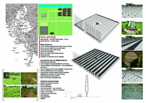 Birinci Dünya Savaşı sırasında İngilizlere esir düşerek Burma’ya götürülen Osmanlı askerlerinden, burada şehit olanlar için yaptırılmış olan şehitlik, bugün yıpranmış 300 kadar mezar taşı, bir taş kitabe ve yer yer yıkılmış çevre duvarı ile yenilenmeye gereksinim duymaktadır. Yıpranmanın yanında, tropik iklimde hızla gelişen yoğun bitki örtüsünün örtücü etkisi ile okunamamakta, iklimsel ve anlamsal tanım eksikliği doğmaktadır. Tasarımda; Kimliksel ve anlamsal okunabilirliğe katkı sağlama,Mevcut taşların algılanabilir hale getirilmesi,Mevcut kitabenin okanabilir kılınması, Etkili doğal çevre içinde, sadeliğin ve dinginliğin vurgulanması,Bakım ve kalıcılık açısından uygun malzeme ve tekniklerin seçilmesi,amaçlanmıştır.