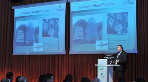 'Yapısal Cam Sistemleri' başlıklı sunumun ilk konuşmacısı Chris Barlow, sözlerine yapısal cam mühendisi olduğunu belirterek başladı. Firmanın, dünya çapında imza attığı tasarımlarının testlerini firmanın kendisinin yaptığını, bu anlamda 12 yıl garanti verebildiklerini aktaran Barlow, ayrıca Pilkington bünyesinde özel bir planar üretimi yapan fabrikanın bulunduğunu sözlerine ekledi.