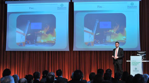 Konferansın son konuşmacısı olan Christian Seibt, "Yangın Güvenliği ve Cam" başlıklı konuşmasında yangına karşı geliştirilen koruma ünitelerinden bahsetti. 'Pyrostop', 'Pyrodur' ve 'pyroclear' olmak üzere bu alanda 3 farklı tip ürünün mevcut olduğunu aktaran Seibt, yangından korunan camların insanları yangından koruyabilmesinin önemine vurgu yaptı. Bu tip bir camın çerçeve sisteminin onaylı olmasının gerekliliğine değinen Seibt, aynı zamanda camın ve çerçeve sisteminin yapının inşa sistemine uygun olmasının önemli olduğunu ifade etti.