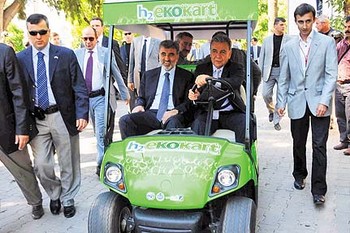 hidrojen yakıt pili ile çalışan otomobille geldi. Çıkışta ise, aracı Bakan