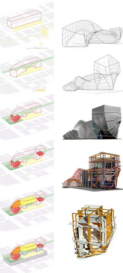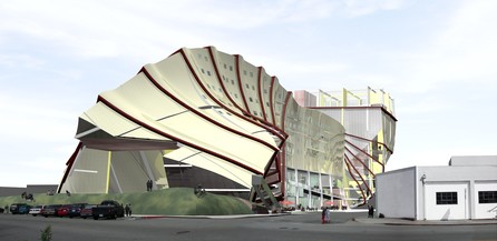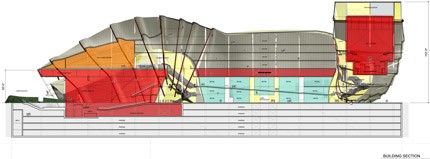 Binanın taban alanını küçültmek için tiyatro programı, 30x30 metre boyutundaki yoğun bir blok içinde planlandı. Güneye açılımın artmasıyla ışık girişi ve kullanımı artacağından, bina, arazinin kuzey kenarını çevreleyecek biçimde konumlandırıldı. Ardından yapı hacmi, her iki uca doğru, üç farklı tipteki tiyatronun birbirlerine uyum sağlayacağı, üç ayrı mekânsal zarf içinde düzenlenerek yayıldı. Yapının biçimi, yüksek hacmi sağlamak, 750 koltuklu “dönen tiyatro” sistemini yaratmak ve şehir manzarasının avantajını kullanmak için dikey olarak doğuya doğru eğildi. Kütle, aynı zamanda, batıya doğru 90 derece burularak, ana araç girişine doğru konumlandırıldı ve 1.650 izleyici kapasiteli, eğimli oturma alanına ve iki ayrı kota sahip tiyatroyu oluşturmak üzere bir nevi araziye saplandı. Yapıdaki bu eğilme, bükülme ve dolaşım hareketleri, daha geniş hacimli alanlar yaratacak ve doğal bir akustik biçimlenme sağlayacak. Tiyatronun arazi içine itilmesiyle bir açıkhava anfitiyatrosuna evsahipliği yapacak bir oylum elde edildi. Sahnenin iki tiyatro arasına konumlandırılmasıyla, çok çeşitli mekânsal konfigürasyonlar elde edildi. Son olarak bir üçüncü çokamaçlı tiyatro, bu hacmin üzerine projenin doruk noktası olan batıdaki tonoz biçiminin üstüne yerleştirildi.