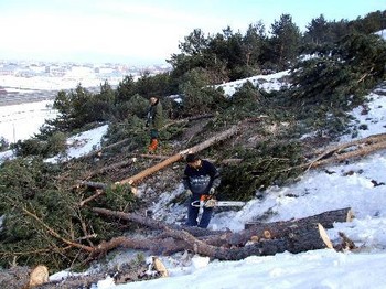 Erzurum'da 2001’de yapılacak olan Üniversitelerarası Kış Oyunları öncesinde kayakla atlama kuleleri için tarihi Kiremitli Tabya'da yaşları 10 ila 15 arasında değişen 100 çam ağacı, Orman Bölge Müdürlüğü elemanları tarafından kesildi. Vali Sami Bulut, ağaçları kesmekten başka çarelerinin olmadığını ileri sürerken, TEMA Vakfı İl Temsilcisi Işıl Bedirhanoğlu, “Üç yıldır kış olunları için taş üstüne taş koymayanlar 2009'a ağaç katliamı yaparak başladı” dedi. Atatürk Üniversitesi Kampusü ile Palandöken İlçesi'nin arasında bulunan Kiremitlik Tabya'da, UNIVERSIAD 2011 için 5 atlama kulesi yapılması kararlaştırıldı. Uzmanlar tarafından en uygun yer olarak kabul edilen Kiremitlik Tabya önünden bugün geçenler, ağaç katliamına tanık oldu. Ellerinde motorlu testerelerle ormanlık alana giren Orman Bölge Müdürlüğü görevlileri, çamları bir bir devirmeye başladı. Çok kısa sürede 100 çam ağacı, karların üstüne yığıldı. Vatandaşlar, medya kuruluşlarını arayarak katliamının önüne geçilmesini isterken, Gençlik ve Spor Genel Müdürlüğü'nde görevli bir kadın mimar, “Mart'ta yurt dışından Kış olunlarını denetleyen komite gelecek. Onların bu alanı ağaçlardan temizlenmiş olarak görmesi gerekiyor. Bu konuda ihtar aldık” dedi. Orman Bölge Müdür Yardımcısı Bekir Celal ise sahanın ağaç nakli yapılmaya elverişli olmadığını belirterek, “Atlama kuleleri yapılacağı için belirlenen bölgedeki ağaçları kesiyoruz. Bu ağaçları kesmeden önce söküp başka bir alana dikmek istedik ancak arazi dik ve meyilli olduğu için araç girmedi. Kesmekten başka çare yoktu. Kestiğimiz ağaçları daha sonra satışa çıkaracağız” diye konuştu. Gençlik ve Spor İl Müdürü Fatih Çintimar, Ormanlık alanın bulunduğu Kiramitlik Tabya'da Kış Oyunları için 5 atlama kulesi yapılacağını belirterek, “Kulelerin mimari çalışması tamamlandı. İhale aşamasına geldi. dünyadaki tüm spor tesislerinde olduğu gibi burada da belli sayıda ağaç kesiliyor. Amerikalılar'ın yaptığı master plan çervesinde çalışmalar tüm hızıyla devam ediyor” dedi. Ormanlık alanda bulunan çam ağaçlarından bazılarını geçtiğimiz yıl söküp çeşitli kurumların bahçelerine diktiklerini ifade eden Vali Sami Bulut, “Bu ağaçların yaşları büyük olduğu için hiçbiri tutmadı. İstemeden kesmek zorunda kaldık. Bu demek değildir ki ormanı hepten yok edeceğiz. Uzmanların belirlediği atlama kulelerinin bulunduğu yerdeki ağaçlar kesilecek. Erzurum'da bu yıl sadece 4 milyona yakın fidan dikilmiştir. 2011 Üniversitelerarası Kış Oyunları için bunu yapmak zorundaydık” diye konuştu. Çam ağaçlarının kesildiğini görünce şoke olduğunu vurgulayan TEMA Vakfı Erzurum İl Temsilcisi Işıl Bedirhanoğlu ise “Çam ağaçları atlama kuleleri için orman bölge müdürlüğü tarafından kesiliyor. Bunlar kesilmeyecek, sökülecek diye karar çıkmıştı.. Ne olursa olsun bundan sonraki ağaçları kestirmeyeceğim. Birilerinin bu katliama bizimle birlikte ‘dur’ demesi gerek. Buradaki ağaçlar taşınamaz diyorlar. Bu çok anlamsız. Üç yıldır kış olunları için taş üstüne taş koymayanlar 2009'a ağaç katliamı yaparak başladı” dedi. |