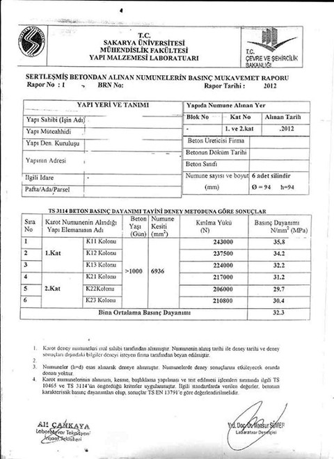 'Üniversite onaylı' Akşam'ın haberine göre, Sakarya İl Emniyet Müdürlüğü Kaçakçılık ve Organize Suçlarla Mücadele Şubesi, geçen yıl gelen 'hasarlı binalar vatandaşa satılıyor' ihbarı üzerine çalışma başlattı. 17 Ağustos'ta az ve orta hasar alan binaları 'makyajlayarak' vatandaşa satan şebekenin üyeleri tespit edildi ve teknik takip başladı. Bazı şebeke elemanlarının Sakarya Üniversitesi'nde görevli bazı öğretim üyeleriyle ilişki içinde olduğunu anlaşıldı. İlerleyen günlerde şebekenin hasarlı binalara 'sağlam' raporunu bu öğretim üyelerinden aldığı anlaşıldı. İşte 'insan hayatının ne kadar ucuz'olduğunu kanıtlayan sahteciliğin belgelere yansıyan öyküsü; "A.C." gitti, "V.D." geldi 1999 depreminde inşaat halinde olan 24 dairelik 'lüks' site büyük hasar aldı. İnşaat Belediye görevlileri tarafından mühürlendi. Aradan geçen zamanda inşaata tek çivi bile çakılmadı. Daireleri tekrar satışa çıkarmak isteyen şebekenin binalar için 'sağlam' raporu alması gerekiyordu. Özel laboratuvarlar 'dayanıksız' raporu gelince çete, öğretim görevlileriyle ilişkilerini kullandı. Şebeke ilk iş, 'A.C' olan firmanın ismini 'V.D' olarak değiştirdi. Ardından Sakarya Üniversitesi İnşaat Mühendisliği Yapı Malzemeleri Laboratuvarına, binalar yeni yapılmış gibi müracaatta bulundu. 2 bin ila 20 bin lira arası rüşvet karşılığında 'Hasarsız' 'Sağlam' ve 'Uygun' raporları alındı. Binaların inşaatı yeniden başladı. Sitenin de adı değiştirildi. Ağır çatlakları olmasına rağmen bina makyaj ve özel mantolama yöntemleriyle 'yenilenerek' satışa sunuldu. 130 ile 150 bin lira fiyat biçilen binaların inşaatı operasyonla durduruldu. Soruşturmanın tamamlanması üzerine polis operasyon için düğmeye bastı. Baskınlarda 4 yapı denetim ve 1 beton firmasının yetkilileriyle Prof. Dr. K.Y., Yrd. Doç. M.S. ve öğretim görevlisi A.Ç.'nin de aralarında bulunduğu 41 kişi gözaltına alındı. Aramalarda yapı denetim firmaların denetlediği 3 bin binaya ait belgeler ele geçirildi. Belgelerin çoğunun sahte olduğu ortaya çıktı. Makyajla satışa çıkar Üniversiteden 'profesör' imzalı 'sağlam' ve 'hasarsız' raporu alan şebeke, ağır çatlakları olan binaları makyajlayıp 150 bin liradan satışa sundu. Emaneti getirin Teknik takiptde, 'ölüm rüşveti'nin pazarlıkları da tek kek kayıt altına alındı. Kayıtlar, öğretim görevlisinin rahat davrandığını da ortaya çıkardı: Müteahhit: Şu numunelerimiz güzel çıksın. Üniversite görevlisi: Olumlu olacak emaneti getirin. Müteahhit: Tamam abi, top sizde. Hocama da selam söyle, gereğini yapın. Üniversite görevlisi: Tamam tamam. Başka bir kayıtta ise firma yetkilileri aralarında, 'İşlem tamam ustalar hızlansın. Rapor kolay siz işi bitirmeye bakın' diyor.