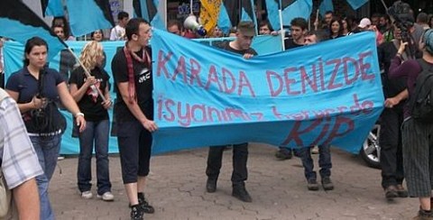 "Karada Denizde Heryerde İsyan" pankartı arkasında bir araya