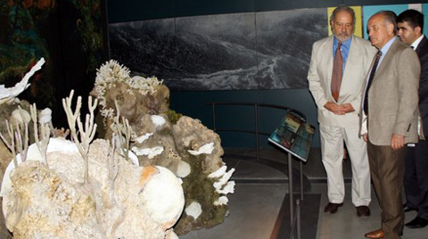 ''coral bleaching'' kurbanı ölü bir beyaz mercan modeli ile karşılaşıyor. Bu ölü