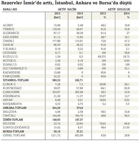 Yaşanan kuraklık nedeniyle toplam 868 milyon 683 bin metreküp su biriktirme kapasitesine sahip İstanbul’un içme suyu barajlarındaki toplam su miktarı 273 milyon metreküpe, doluluk oranı ise yüzde 31.7 seviyesine indi. Bu oran geçen yıl yüzde 66 idi. İstanbul’da şehre günlük 2 milyon 468 bin metreküp su verildiği dikkate alındığında, şu anda kente 110 gün yetecek kadar su bulunuyor. Bu da yağışların yağmaması halinde 14 milyonluk kenti susuz bir yazın beklediğini ortaya koyuyor.