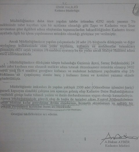İstanbullu İşadamı İbrahim Cevahir ve ortaklarının talep ettiği Sarnıç’taki binlerce dönüm arsa ve arazilerle ilgili tartışmalar devam ediyor. CHP İzmir Milletvekili Erdal Aksünger konuyu TBMM gündemine taşırken aynı bürokratın iki farklı imzalı yazısı olduğunu ifade etti.