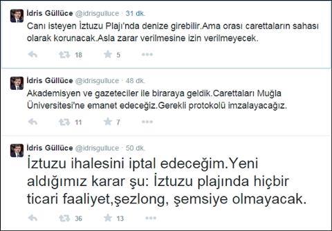Konuyla ilgili olarak Çevre ve Şehircilik Bakanı İdris Güllüce'de Twitter üzerinden açıklamalarda bulundu. İşte Güllüce'nin açıklamaları: -İztuzu İhalesi'ni iptal edeceğim. Yeni aldığımız karar şu: İztuzu Plajı'nda hiçbir ticari faaliyet, şezlong, şemsiye olmayacak. -Akademisyenler ve gazeteciler ile bir araya geldik. Carettaları Muğla Üniversitesi'ne emanet edeceğiz. Gerekli protokolü imzalayacağız. |