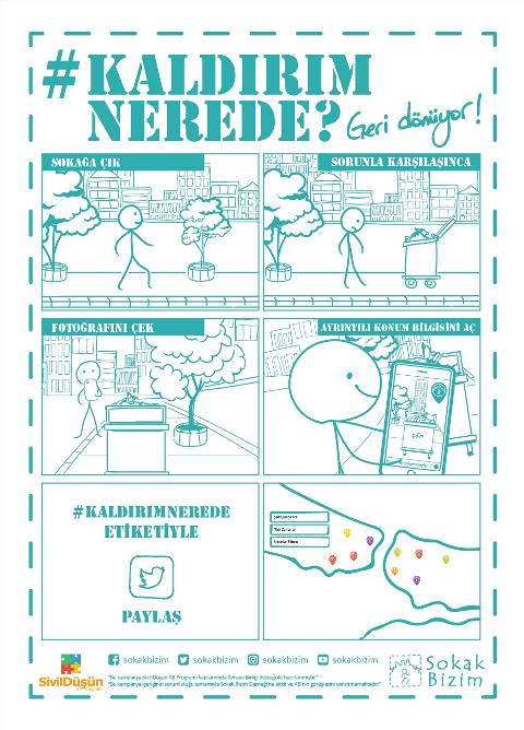 Türkiye'nin tüm kentleri kampanyaya davetli Sokak Bizim Derneği, paylaşımları haritalayarak sorunun mekânsal görünürlüğünü artırmayı ve farkındalık oluşturmayı amaçlıyor. Yerel aktörlere de bu hususta inisiyatif alma çağrısı yapıyor. Ocak 2018’de tüm kentlerden paylaşıma açık olarak başlayan ‘Kaldırım Nerede?’ kampanyası, bu ortak soruna karşı harekete geçmek isteyen herkesi bu interaktif sürece davet ediyor.