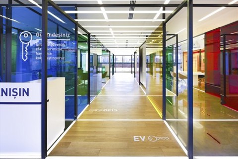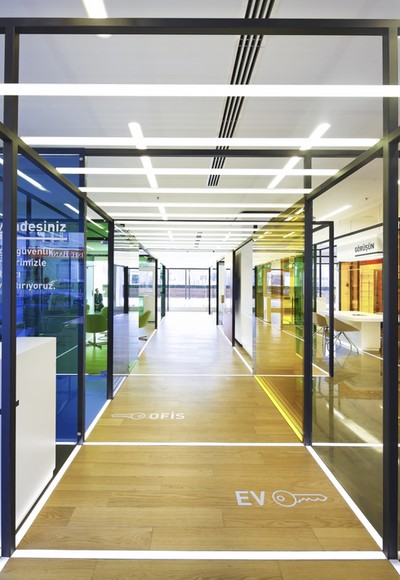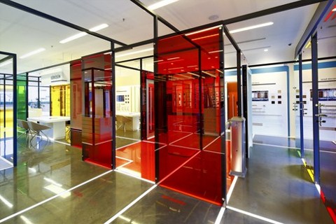 desteklenmesi için yarı şeffaf cam yüzeylerden oluşan mekanı bölücüler de