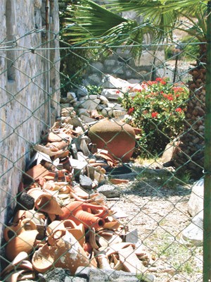 seramik ve mermer buluntular, eski sandıklar içinde ve kazı evinin duvarı