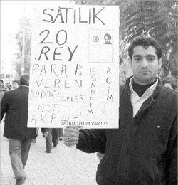 Ekonomik kriz nedeniyle işyerini kapatmak zorunda kalan ve borçları yüzünden mahkemelik olan Antalyalı esnaf Hasan Bakarlı, “Satılık 20 rey” yazılı bir pankartla kent sokaklarını dolaştı. Bakarlı, “Kriz teğet geçmedi. Evimde suyum bile kesik. AKP her şeyimizi sattı. Ben de oyumu satıyorum” dedi.