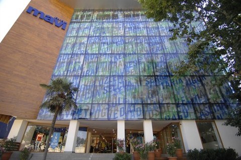 Mavi Jeans’in 4. Levent’teki yeni merkez binasının cephesi, çalışanlarının isimlerinden oluşan tasarımı ve alışılmışın dışındaki görüntüsüyle dikkat çekiyor. Modern sanat müzelerini anımsatan binanın cephe tasarımı Erginoğlu&Çalışlar Mimarlık, cam yüzey tasarımı ise Grafik Tasarımcı Esen Karol tarafından yapıldı. Ahşap dokunun yanı sıra mavi, yeşil ve kahverengi renklerdeki yazılarla kaplı cam dış cephe, sıcak görünümüyle Mavi’nin Akdenizli ruhunu yansıtıyor. |