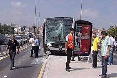 Okmeydanı'nda kontrolden çıkan metrobüs, duraktaki reklam panosuna çarparak durabildi. Meraklı vatandaşların kazayı izlemek istemesi trafiği alt üst etti.