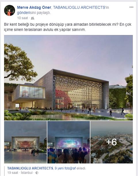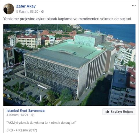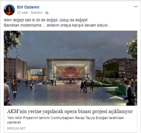 Tabanlıoğlu Mimarlık: “Cepheye Dokunulmaması Kadirşinaslıktır” 'Yeni AKM'nin Tanıtım Filmi Yayınlandı Tabanlıoğlu Architects’in Facebook hesabından paylaştığı görsel ve metinler şu şekilde: "Binlerce yıllık kültür şehri İstanbul’a yirmi birinci yüzyılın kültür-sanat merkezi. Tabanlıoğlu Mimarlık’ın kurucusu ve Murat Tabanlıoğlu’nun babası Hayati Tabanlıoğlu tarafından tasarlanan Atatürk Kültür Merkezi ana fonksiyonları olan opera ve bale için hizmet verecek çağdaş salonların yanısıra, çok kapsamlı bir kent kültür yapısı olarak, bugün, 21. yüzyılın başında, ve bu günün imkan ve yaklaşımlarıyla, yeniden İstanbul’a kazandırılıyor." "Ana binaya eklemlenen kültür sanat birimleri vasıtasıyla AKM, tek bir binadan, geniş kapsamlı, büyük bir kültür kompleksine dönüşmüş olacak, bu kademeli binaların üzerinde, İstanbul’un en etkileyici manzaralarına açılan bir kentsel park yer alacak." "Opera binalarının en dikkat çeken unsurlardan biri olarak, AKM’nin ön cephesinde yer alan meydanla ilişkisi güçlendirilecek" "AKM’nin korunan özgün cephesi aynı zamanda dünyanın en büyük ekranlarından biri olarak kullanılabilecek; böylelikle içeride gerçekleşen temsiller dışarıda, yüksek nitelikli bir ekran aracılığıyla seyredilebilecek." Sosyal medyada mimarların yeni AKM projesiyle ilgili yaptığı yorumlar ise şöyle: Mimarlar Odası: "AKM’yi Yıkıma Terk Etmek de Yıkmak da Suçtur!" |