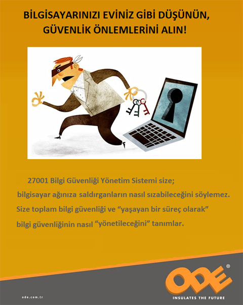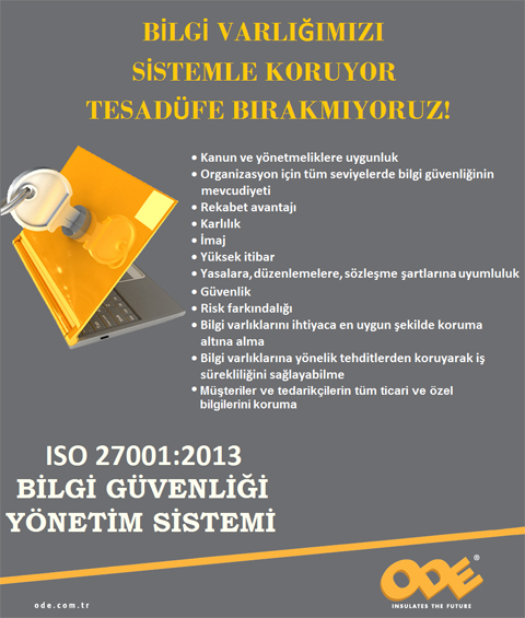 ISO 27001:2013 belgesi ile kendilerinin ve paydaşlarının teknik, ticari ve özel bilgilerini güvence altına aldıklarını belirten ODE Yalıtım Genel Müdürü Ali Türker; “Şirketler için günümüzde kurumsallaşma, yönetim kalitesini geliştirmeyi ve bu gelişimi sürekli kılmayı gerektiriyor. Kuruluşundan bu yana sürekli büyüyen ve gelişen ODE için, 30. yılımızı kutladığımız bir süreçte, kurumsallaşma alanında kaydettiğimiz her aşama çok önemli. Bu sürecin en önemli adımlarından biri de sürdürülebilirliği sağlayan, ürün ve hizmetlerimize yönelik belgelendirmeler. ODE’nin ve tüm paydaşlarımızın bilgi altyapılarının emniyetini sağlamak için faydalandığımız ISO 27001 Bilgi Güvenliği Yönetim Sistemi, olası tehlikeleri sezinleme, analiz etme ve riskli durumlarda uygulanacak kontrol sistemlerine karar vermeyi mümkün kılıyor. ODE’nin sürekli gelişim vizyonu paralelinde oldukça önemli bir adım olan bu gibi çalışmalarımızı sürdürmeye devam edeceğiz” diye konuştu.