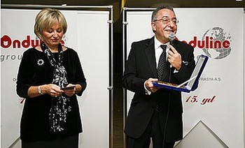 Onduline Avrasya, sanata verdiği desteği sürdürüyor. İstanbul Devlet Senfoni Orkestrası'nın geleneksel hale gelen yılbaşı konseri Onuduline Avrasya’nın katkılarıyla Caddebostan Kültür Merkezi’nde gerçekleştirildi. Avusturyalı solistler İstanbul Senfoni Orkestrası ve Şef Alexander Rahbari’nin yönetiminde seçkin operetlerden oluşan bir repertuar seslendirdiler. Sanatseverlerin büyük ilgi gösterdikleri konserde, aralarında F. Lehar, J. Strauss, ve E. Kalman’ın eserlerinden oluşan toplam 13 eser seslendirildi. Konser sonrası davetlilerin ve tüm orkestranın katıldığı bir resepsiyon düzenlendi. Resepsiyonda IDSO Yönetim Kurulu üyesi Gülten Çapan, Onduline Avrasya'nın 3 yıldan bu yana IDSO'ya vermiş olduğu destekten dolayı teşekkür ederek Onduline Avrasya Yönetim Kurulu Başkanı Burhan Karahan'a teşekkür plaketi sundu. Burhan Karahan ise yaptığı konuşmada Onduline Avrasya olarak krize rağmen kültür faaliyetlerine verecekleri desteğin devam edeceğini ve önümüzdeki yıl IDSO’ya verecekleri desteği artıracaklarını ve bu çerçevedeki faaliyetleri desteklemeye devam edeceklerini dile getirdi. Şef Alexander Rahbari ve solistlerin de ödüllendirildiği gecede Rahbari, IDSO ile konser vermekten büyük mutluluk duyduğunu ve IDSO’nun her yıl kendisini geliştirdiğini gözlemlediğini, geceki performanslarının 11 yıldır süren çalışmalarının ve IDSO'nun özel gayretlerinin bir sonucu olduğunu ve bu performansla devam ettikleri sürece daha uzun yıllar İDSO'’yu yönetmekten keyif duyacağını dile getirdi. |