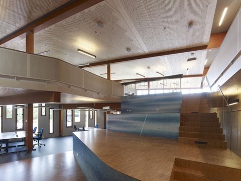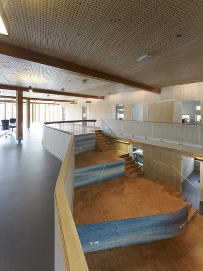 Kuzey cephesinde hafif ahşap cephe en üst düzey esneklik ve açıklığı sağlıyor. Üzerinde ahşap kirişler bulunan bu cephe, çalışanların bir araya gelebildikleri merkezdeki hacimde yapının sosyal gücünü destekliyor. Ayrıca, yeşil çatı terası da başka bir toplanma mekânı sunuyor.