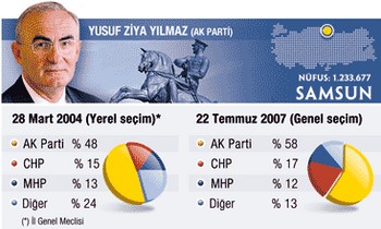 Kuzey'in İstanbul'u Samsun'da, AK Parti seçimlere rahat giriyor. Türkiye ortalamasının üzerinde bir oy bekleniyor. AK Parti'nin adayı, iki dönemdir şehrin büyükşehir belediye başkanlığı görevini yürüten Yusuf Ziya Yılmaz. 1951 Samsun doğumlu Yılmaz, makine mühendisi. Karayolları'nda 23 yıllık bir hizmetten sonra 1999 yılında siyasete atılmış. O günden bu yana Samsun'un büyükşehir belediye başkanı. Adaylık süreci bir hayli sancılı geçti. Yusuf Ziya Yılmaz'ın aday olup olmayacağının son ana kadar açıklanmaması diğer partilerin de dengesini bozdu. AK Parti, Yılmaz'ı yeniden aday gösterdi. Sahil projesini hayata geçiren ve bu amaç için gıda toptancılarıyla arası açılan Başkan, "Samsun'u denizle buluşturan başkan" olarak anılıyor. Mezbelelikten kurtardığı Samsun sahilini Karadeniz'in en güzel sahili haline getirmiş. Sahilin doğu ve batı kesimindeki çalışmalar (park, yeşil alan, oyun bahçeleri, protokol yolu ve tütün iskelesi) ile şehrin trafiğini rahatlatacak olan 2. Bulvar Yolu halkı memnun etmiş. Başkan'ın bir başka avantajı yapımına başlanan 17 kilometrelik şehir içi raylı ulaşım sistemi. Aynı hatta yolcu taşıyan minibüs şoförleri bile kendi kazançlarının azalması anlamına gelen bu projeyi destekliyor. Trafiği rahatlatacak otoparkların azlığı, kaldırım ve kanalizasyon gibi düzenlemelerin yetersizliği ise bir handikap. Civar illerden günübirlik göç alan Samsun'un hedefi bölgenin ticaret ve sağlık merkezi olarak bir marka haline gelmek. Hükümet, önümüzdeki dönem tamamlanması beklenen 400 yataklı Bölge Eğitim Hastanesi ve 250 yataklı Ruh ve Sinir Hastalıkları Hastanesi'yle sadece bölgeden değil, Karadeniz'e komşu bütün ülkelerden şehirde bir sağlık turizmi sektörü oluşturmayı hedefliyor. Bir de eğitim projesi var. Ondokuz Mayıs Üniversitesi'nin yanında Samsun, ikinci bir üniversiteye kavuşmak üzere. Bir vakıf üniversitesi kurulmasının projesi de yapılmış. 20 milyon dolara mal olacak Canik Başarı Üniversitesi, Fen-Edebiyat Fakültesi, Mühendislik Fakültesi, Sanat ve Sosyal Bölümleri Fakültesi ve Meslek Yüksekokulu olmak üzere toplam 16 bölümde eğitim verecek. Hükümetin, sağlık eğitim, kentsel dönüşüm ve KÖYDES projelerinin yanı sıra Samsun-Ankara bölünmüş yolu ile Samsun-Bafra yolundaki genişletme çalışması da halkın gözünde kıymet bulan çalışmalar. Samsunlunun beklentileri birkaç noktada yoğunlaşmış: İstihdama yönelik yatırımların önünün açılması, trafik, otopark ve hava kirliliği sorunlarının çözülmesi. Halkı en fazla ilgilendiren konuların başında; fındık, tütün, Samsunspor ve Türkiye Bayanlar Basketbol 1. Lig takımlarından Samsun Basketbol Kulübü (SBK) geliyor. CHP-Mehmet Atalay: Halkçı bir belediye vaat ediyor Samsun'un bir numaralı problemi işsizliğe savaş açacağız. Sosyal belediyecilik kapsamında yoksullukla mücadele edeceğiz. Samsun, çağdaş ve uygar bir şehir olacak. Samsunspor'a da sahip çıkacağız. MHP-İbrahim Özyer: Samsunluluk ruhu için çalışacak Ciddi anlamda eksikliği hissedilen ve kasıtlı olarak oluşturulmayan kent bilincinin şehre kazandırılması için tabuları yıkacağız. Samsunluluk ruhunu her alanda etkin kılacağız.