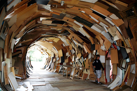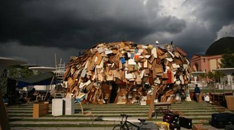 Alman Raumlabor mimarlık şirketi, eski sandalye, buzdolabı ve tahta parçalarından tiyatro binası inşa etti.