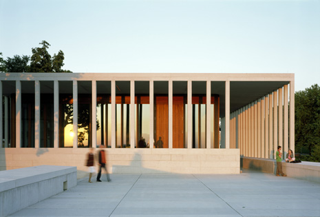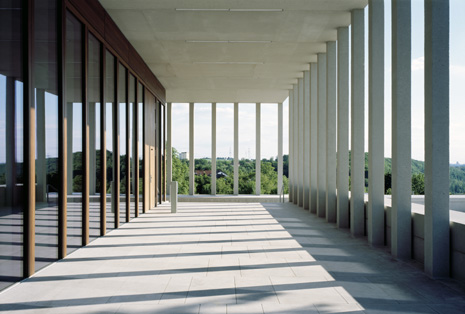 En yüksek noktadaki ana giriş, cam ve klasik tapınak yaklaşımını gösteren ince sütunlar ile basitce tasarlanmış beton pavyondan oluşuyor.