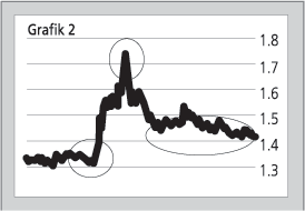 5- Yine bir banka çalışanı tarafından, 2006 Mayıs sonrası oluşan 1.35-1.75 bandındaki dolar dalgalanmasında önerilen "Dolar kredilerinizi kapatın" önerisine son derece sert olarak TV programlarında ve bu köşede karşı çıkmış; "Dalgalanan kur patlar ve çöker, yüksek fiyattan kredi kapatmayın, bekleyin" tezini ortaya atmıştım, hala aynı noktada mıyım? Bekleyemeyenler, panik olanlar 1.55-1.75 bandında kredilerini kapattılar. Bekleyenler hala kârlı bir şekilde ödeme yapmaya devam ediyorlar. Özellikle 2002-2006 döneminde alınan dolar bazlı kredilerin, kur 1.8 YTL’yi aşmadığı sürece aynı dönemde alınan TL bazlı kredilere göre kârlı olduğunu daha önce tespit etmiştik. Aynı tezi kullanabilir ve "bekleyebiliriz." O gün "dolar kredilerinizi kapatın" çağrısına uymayanlar, bugün aylık taksitlerini 1,40-1,45 arasında ödüyorlar. Bu gerçeği grafik üzerinde de rahatlıkla görebilirsiniz.
