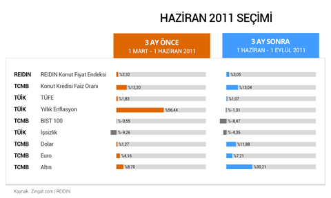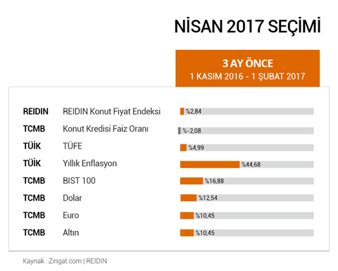 Reidin Türkiye, 16 Nisan 2017 Pazar günü gerçekleştirilecek referandum öncesinde Haziran 2011, Haziran 2015 ve Kasım 2015 tarihli seçimlerin konut piyasasına yansımalarını ele alan bir incelemede bulundu. Haziran 2011, Haziran ve Kasım 2015 ve Nisan 2017 seçimlerinin üç ay önce ve sonrasındaki sonuçları değerlendiren Zingat.com CEO'su Ahmet Kayhan görüşlerini şöyle açıkladı: “Görünen o ki, seçim öncesi belirsizlik olan dönemlerde gayrimenkul sektöründe fiyat artışı yavaşlarken, belirsizliğin ortadan kalktığı dönemlerde genellikle fiyatlar artmış. Bununla birlikte rakamsal verilere baktığımızda, referandum sonuçları ne olursa olsun sektörü etkileyen konut kredisi faiz oranları, döviz, inşaat maliyetleri gibi indikatörlerdeki seçime bağlı olmayan temel değişimlerin beklentilerin ötesinde daha büyük etki yarattığını söylemek doğru olacak.” Mart ve Haziran 2011 arası dönemde Reidin Konut Fiyat Endeksi yüzde 2,32, konut kredisi faiz oranı yüzde 12,20, TÜFE 1,83, BIST 100 Endeksi yüzde -0,55, işsizlik yüzde -9,26, Dolar kuru 1,27, Euro kuru 4,16 ve altın değeri yüzde 8,70 değişim gösterdi.