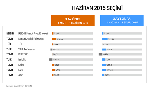 Mart ve Haziran 2015 arası dönemde Reidin Konut Fiyat Endeksi yüzde 3,04, konut kredisi faiz oranları yüzde10,99, TÜFE yüzde 1,68, BIST 100 Endeksi 0,72, işsizlik yüzde -9,43, dolar kuru 4,25, Euro kuru 7,12 ve altın yüzde 3,42 değişim gösterdi. Seçimden sonraki üç aylık dönemde ise başta Dolar, Altın ve Euro olmak üzere, Haziran 2011 dönemine benzer şekilde, makro göstergelerin değişim değerlerinde yükseliş gözlemlendi. Dolar kuru seçim öncesi üç aylık dönemde yüzde 4,25 artarken, seçim sonrası üç aylık dönemde yüzde 11,48'lik artış gösterdi. Euro'nun seçim sonrası üç aylık değişimi yüzde 11,48 iken; altındaki üç aylık değişim yüzde 6,66 olarak gözlemlendi. BIST 100 Endeksi de Haziran 2011 seçim dönemindeki senaryoya benzer şekilde, yüzde -9,84'lük üç aylık değişimle azalışına devam etti.