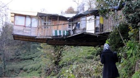 benzeri bulunmayan çelik halatlarla asılı ev, arazinin alt tarafındaki evlerin