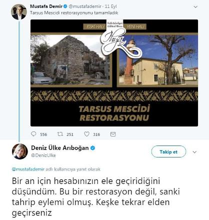 Seda Özen Tarsus Mescidi üzerine sorular gelince genel olarak yazayım dedim. Taş doku görmeyi seviyoruz ancak yapıların bir kısmı Horasan sıvalıdır. Hacer Foggo Sulukule'yi nasıl tamamen yıkıp "restore"ettiyse Tarsus Mescidi aynı olmuş. Bátor Alpsson Tarsus Mescidi nereye gitmiş? HuseyinKarakoc Sn Başkanım bu Tarsus Mescidi Taşlardan inşa edilmiş ancak sizin restorasyon yaptık dediğiniz mescit sanki betonarma olmuş. Yanlışlık Yokmu? Restorasyona tepki gösteren isimlerden biri de Prof. Deniz Ülke Arıboğan oldu. Prof Arıboğan, "Bir an için hesabınızın ele geçirildiğini düşündüm. Bu bir restorasyon değil, sanki tahrip eylemi olmuş. Keşke tekrar elden geçirseniz" sözleriyle Başkan Demir'e tepkisini dile getirdi. Fatih Belediyesi'nin resmi hesabından ise restorasyonu eleştiren kullanıcılara "Tarsus Mescidi Restorasyonu Hakkında Açıklama" başlığı altında cevaplar gönderildi. Açıklamada şunlar kaydedildi: "Mescidin hayata kazandırılması için 2009 yılında rölöve, restitüsyon, restorasyon projeleri hazırlatılmış ve Koruma Kurulu tarafından onaylanmıştır. Onaylı projeler doğrultusunda restorasyon çalışmalarına başlanmış ve 2012 yılında bitirilmiştir. Mescid zamanında taş duvar üzeri sıva olarak inşaa edilmiştir. Tamamen harap durumda olan ve zamanında bir mahalle mescidi olarak kullanılan yapının giriş cephesi ve sol duvarı tamamen yıkılmıştır..." "Mescid genelinde yıkılmış ve strüktür olarak taşıyıcılığını yitirmiş olan beden duvarlarının onaylanmış malzeme ile güçlendirme ve arkasından horasan harcı ile sıvanarak restorasyon çalışmaları tamamlanmış, mescid üst çatı örtüsü yapılmıştır. Yıkılmış durumda olan mescid minaresi onaylı projeler doğrultusunda tamamlanmıştır." Fatih Belediyesi restorasyonu eleştiren kullanıcılara cevap olarak Tarsus Mescidi'nin eski ve yeni halinin fotoğraflarını da gönderdi. Belediye tarafından gönderilen yanıtlarda projenin detayları da yer aldı.