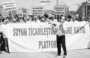 Çok sayıda sivil toplum kuruluşunun destek verdiği “Suyun Ticarileşmesine Hayır Platformu”, 2009 yılı Mart ayında İstanbul’de gerçekleştirilecek “5. Dünya Su Forumu”nu suyu ticarileştirdiği gerekçesi ile protesto etti. Taksim tramvay durağında biraraya gelen ve aralarında CHP, DSP, SHP, DİSK, KESK ve İstanbul Tabip Odası’nın da bulunduğu çok sayıda kuruluş “Su Haktır Satılamaz”, “Kahrolsun Emperyalizm ve İşbirlikçisi AKP” yazılı pankartlar açtı. Platform adına açıklama yapan Türk Mühendis ve Mimar Odaları Birliği İstanbul İl Koordinasyon Kurulu Genel Sekreteri Tores Dinçöz, dünyanın pek çok yerinde içme sularının dağıtımının özelleştirildiğini belirterek, “Suyun ticarileşmesi yoksul halkların tepkisiyle karşılaşılmıştır” dedi. |