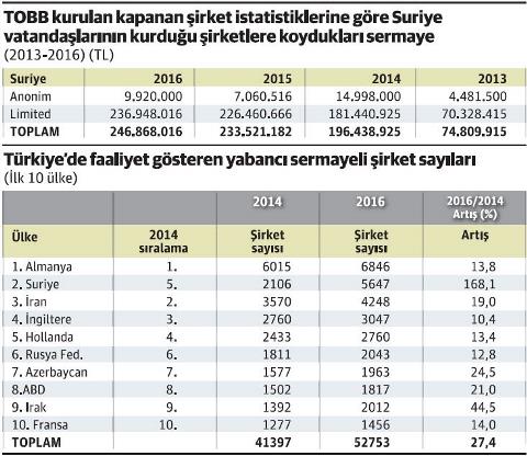 Dünya Gazetesi'nden Mehmet Kaya'nın haberine göre, Türkiye, Suriyelilerin en fazla yatırım yaptığı ve şirket kurduğu ülkeler arasında bulunuyor. Suriye vatandaşları tarafından kurulan ve yabancı sermaye niteliğindeki şirket sayısı 2016 sonunda 5 bin 647 oldu. Suriye, Türkiye’de en fazla yatırım yapan ülkelerde Almanya’nın ardından ikinci sıraya yerleşti. Türkiye’de 6 bin 846 adetle en fazla Almanya menşeli yabancı sermayeli şirket bulunuyor.