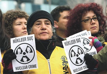 Greenpeace, nükleer santral ihalesini, Kızılay’daki gökdelenden halatlarla sarkarak açtıkları ‘Quit on time (zamanında vazgeç)’ pankartıyla protesto etti. Greenpeace üyesi bir grup dün Ankara’da ‘nükleer santral ihalesinde TETAŞ, Enerji Bakanlığı ve hükümetin yasadışı bir süreç işlettiği’ iddiasıyla Kızılay’da broşür dağıtırken, altı Greenpeace üyesi, meydandaki gökdelene çıktı. Binanın tepesinden halatlarla aşağıya sarkan iki eylemci, ‘Quit on time (zamanında vazgeç)’ yazılı minik bir pankart açtı. Gökdelendeki eylem polisin müdahalesi üzerine olaysız sonlandırıldı. Göstericiler arasındaki bir kadın, eylemcilerden birisinin torunu olduğunu belirterek, “Torunum insanlık için faydalı şeyler yapıyor. Onunla gurur duyuyorum” diye konuştu. |
