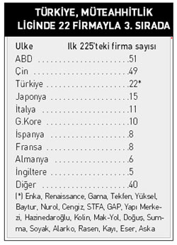 ürk müteahhitlerin uluslararası arenada kazandıkları başarılar tescillendi. 22 Türk inşaat firması, dünyanın en büyük 225 müteahhitlik firması arasına girmeyi başardı. Türkiye, listede ABD ve Çin'in ardından üçüncü sıraya yerleşti.