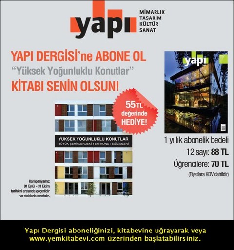 Mimarlık, kültür ve tasarım başta olmak üzere çeşitli konuları, ekonomiden sanata kadar yayılan geniş bir yelpazede ele alan YAPI Dergisi, Ekim ayı sonuna dek geçerli olacak abonelik kampanyasında, 1 yıllık abonelik yaptıran herkese, YEM Yayın kitaplarından, satış fiyatı 55 TL olan "Yüksek Yoğunlukluklu Konutlar" kitabını hediye ediyor.
