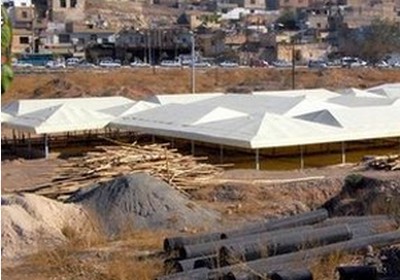 mozaiklerin korunması için üzerlerine çadır branda çekilmiş ve mozaiklerin