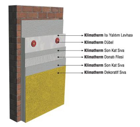 Dyo’nun dış cepheye yönelik ürün gamının ısı yalıtım ürünleri ile birleştiği Klimatherm, 2006 yılından bu yana ısı yalıtımı alanında hizmet veriyor. Binalarda yüzde 50’ye varan enerji tasarrufu sağlayan Klimatherm, yalıtım eksikliğinden kaynaklanan yoğuşma sorununu çözerek küf, bakteri oluşumu gibi sorunları ortadan kaldırıp binalardaki yaşam konforunu da artırıyor. Dyo Klimatherm uzmanları, termal kamera ile yapılan çekimlerle binadaki ısı kayıplarını raporlayarak, binanın özelliklerine ve bulunduğu bölgenin hava şartlarına göre en doğru malzemenin belirlenmesi konusunda öneriler getiriyor. Proje Renklendirme de Klimatherm’in öne çıkan hizmetlerinden biri. Dyo’nun binlerce renk seçeneği arasından gerçeğe en yakın renklendirme yapılarak, binanın yalıtım sonrası nasıl bir görünüme sahip olacağı önceden görülebiliyor. Klimatherm Isı Yalıtım Sistemi’nin uygulandığı binalarda, Dyo’nun üstün teknolojileri ile dikkati çeken PTFE katkılı boyası Teknotex ve nanoteknolojik boyası Nanotex kullanılıyor. Akrilik emülsiyon esaslı Dyo Teknotex, PTFE katkısı sayesinde yüksek kir ve su itme direncine sahip. Yağmur suyu ile kendini temizliyor ve yüksek su buharı geçirgenliği ile nemin dışarı çıkmasına da olanak tanıyor. Ayrıca güneş ışınları ve deniz kıyılarındaki tuzlu nemin olumsuz etkilerine karşı da son derece dayanıklı bir boya. Fotokatalitik özelliği taşıyan Dyo Nanotex ise ışıkla kendini temizleyebiliyor.