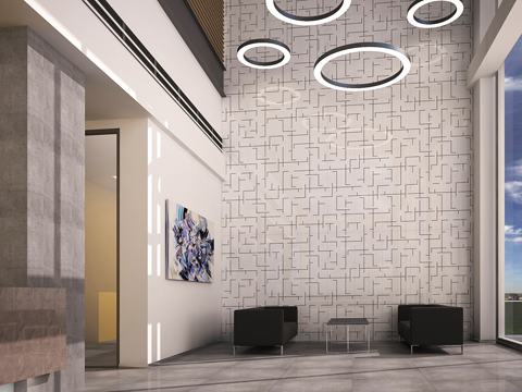 BERNA TANVERDİ / GAIA: Yakın çekim doğa fotoğraflarından esinlenilerek, “çimen”, “yeşil” ve “bitki” çağrışımlarının geometrik stilizasyonu ile yaratıldı. Belirgin bir simetri kaygısı taşımaksızın, doğadaki çeşitliliği ve birbirinden farklılığı vurgulayan kırık açılarla iç içe geçen lineer formlar girintili ve çıkıntılı yüzeyler oluşturuyor. Yeşil tonlar grileştirilerek pastel tonlarında kullanıldı. Renk tonlamaları ile yakınlık-uzaklık ilişkisi ile üç boyutluluk oluşturuldu. Duvar karoları 30x90, zemin karoları ise 60x60 olarak üretildi.
