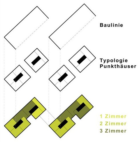 bu yöne bakan bina cepheleri de dingin bir kentsellik sergiliyor. Kompakt bina formu ve son model ısıtma-havalandırma-klimalandırma sistemleri (jeotermal ısı pompaları, solar paneller), projenin ‘pasif ev’ standartlarına uygunluğunu sağlıyor. Kamusal işlevlere ayrılan zemin katta; tümü güneydeki oyun alanı/parka bakan ve ayrı girişleri olan kent meydanı, çocuk yuvası ve muayenehaneler yer alıyor. Projeye ait diğer görseller için lütfen ilerleyiniz.